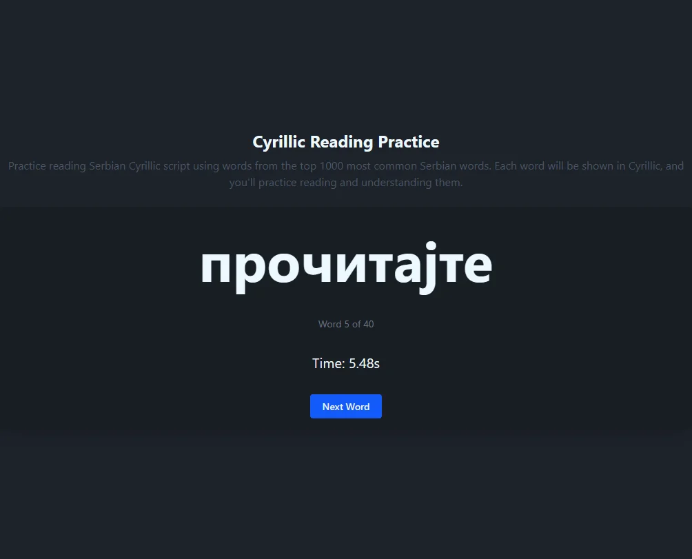 Welcome to my journey in creating something unique. I've been a developer for many years, and at the start of 2025, I started learning Serbian. I found the process challenging in several ways, so I began building my own tools to help me out. It all started with a simple idea: to create a tool that would make reading Cyrillic script easier. I never imagined it would evolve into a full-fledged learning platform.